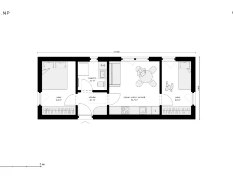 Dispozice: Objekt má jedno nadzemní podlaží s jednou jednotkou 3+kk – vstup, obývací pokoj s kuchyňským koutem, koupelna, ložnice a pokoj. Lze i ve variantě 2+kk – vstup, obývací pokoj s kuchyňským koutem, koupelna, ložnice